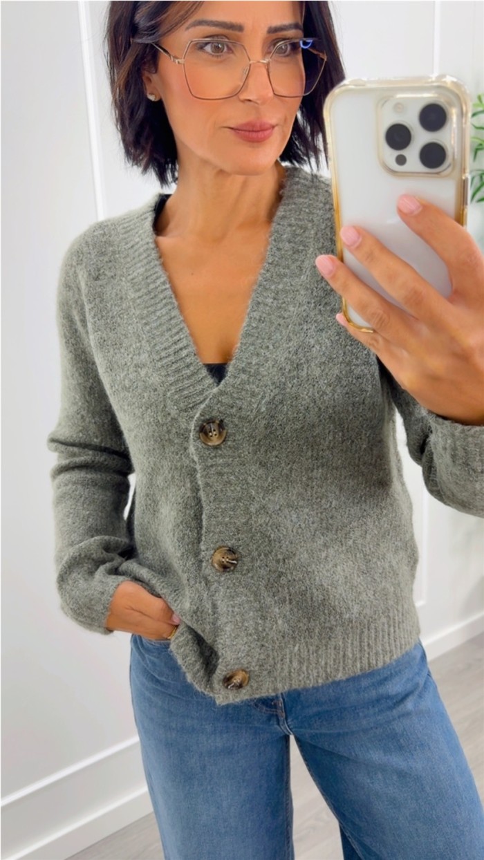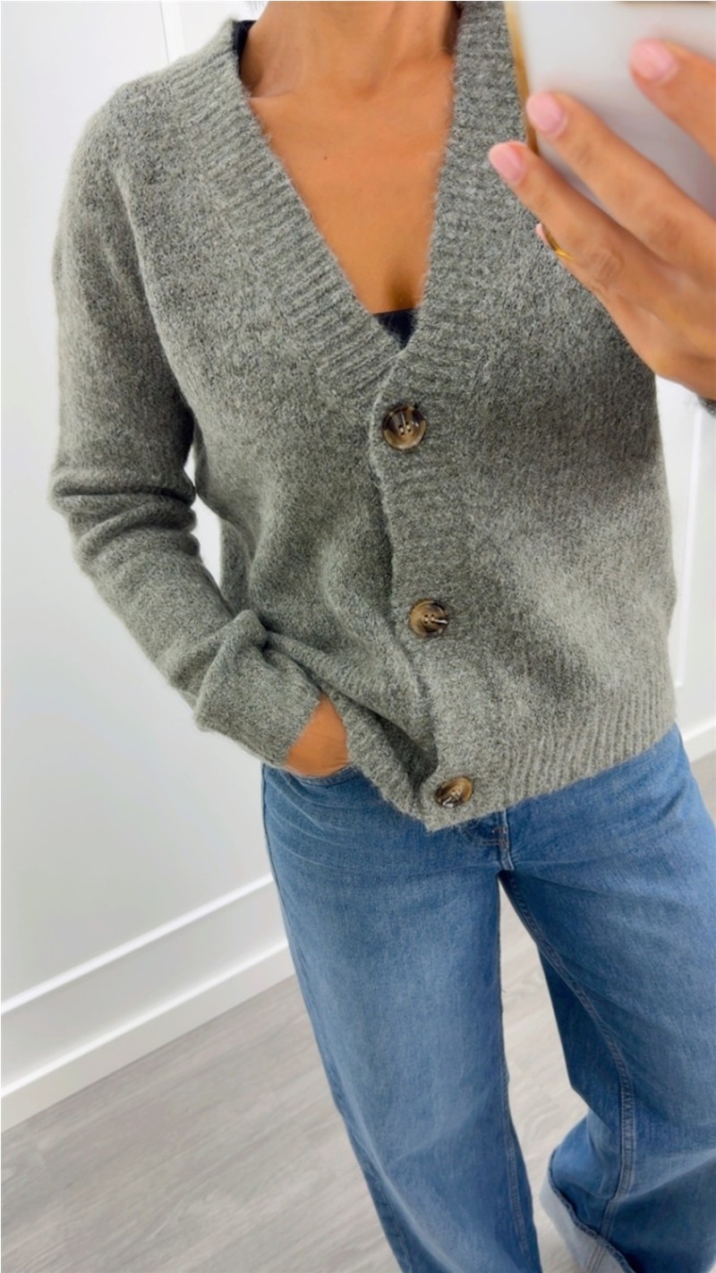 chaqueta escote pico, botones marrones, suave y ligera GRIS