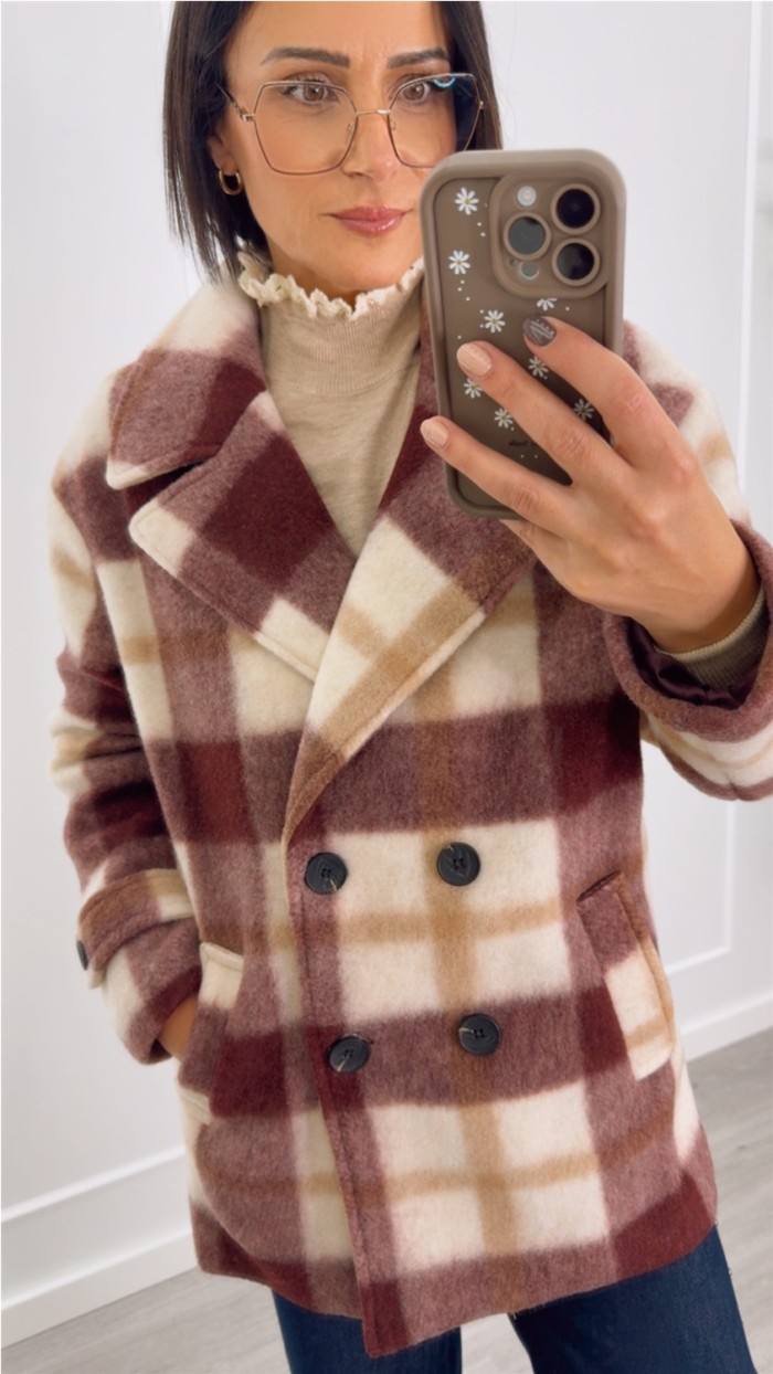 ABRIGO TRES CUARTOS CUADROS BURDEOS BEIGE Y CAMEL COLOR FOTO