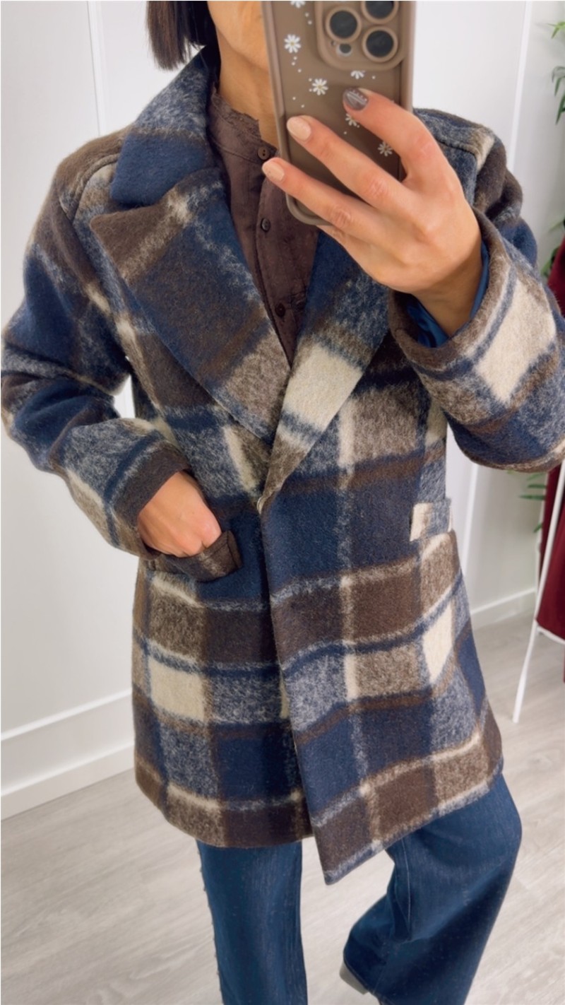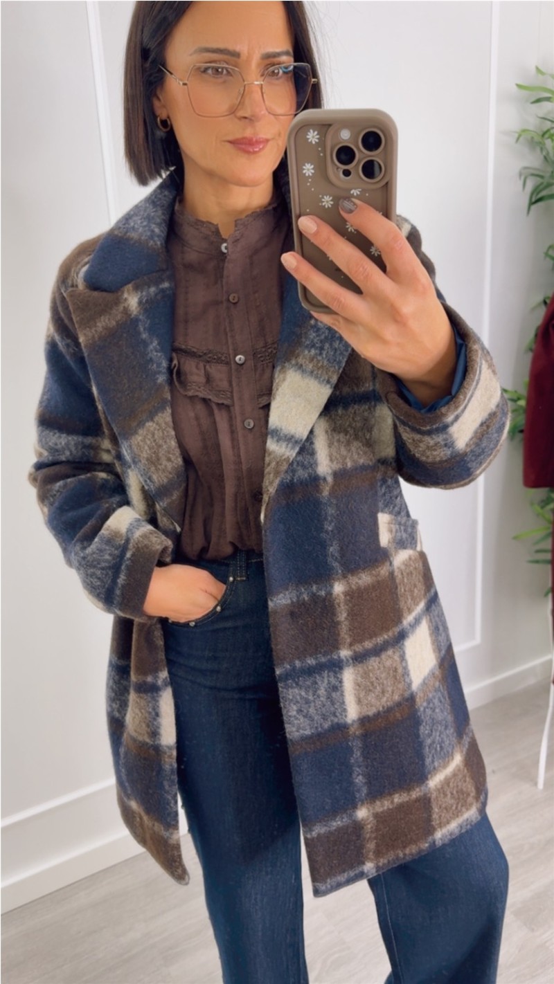 ABRIGO TRES CUARTOS CUADROS AZUL MARINO MARRÓN Y BEIGE, CRUZADO, SUAVE COLOR FOTO