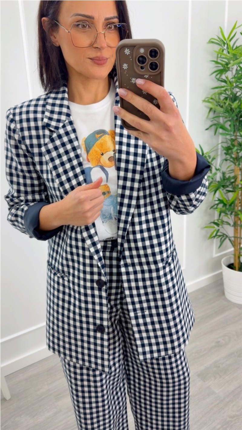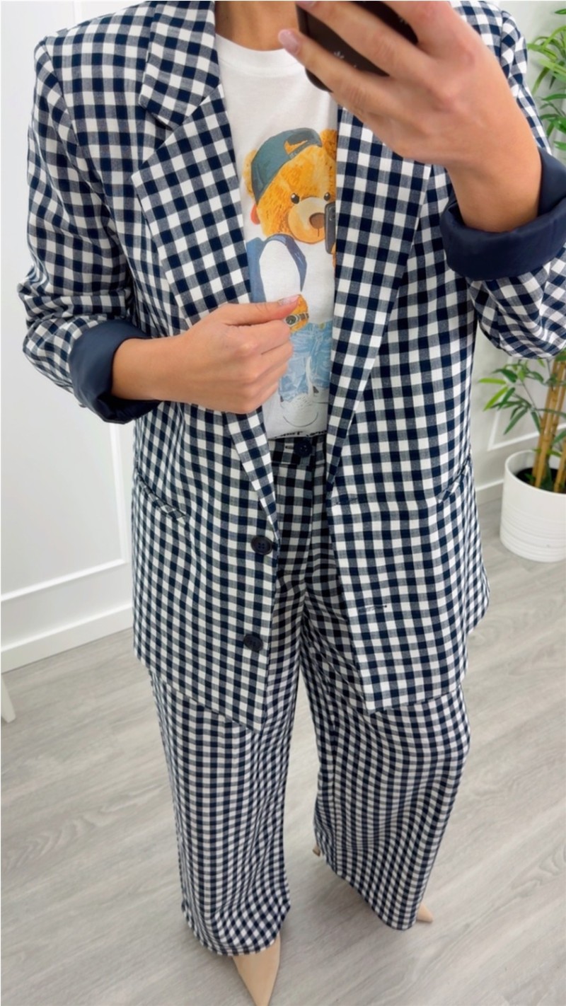 blazer cuadros vichy fluída camel y azul marino