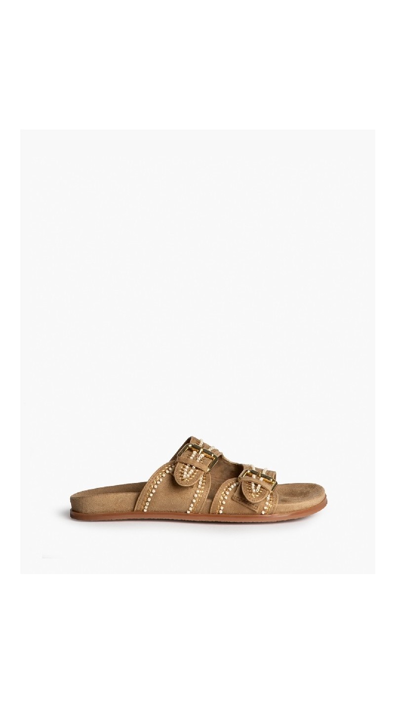 SANDALIA DOBLE TIRA DETALLES DORADOS CAMEL
