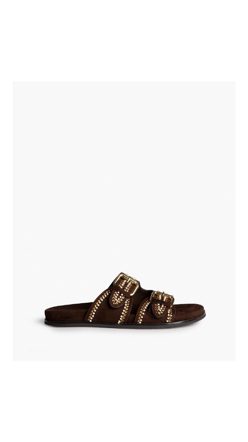SANDALIA DOBLE TIRA DETALLES DORADOS MARRON