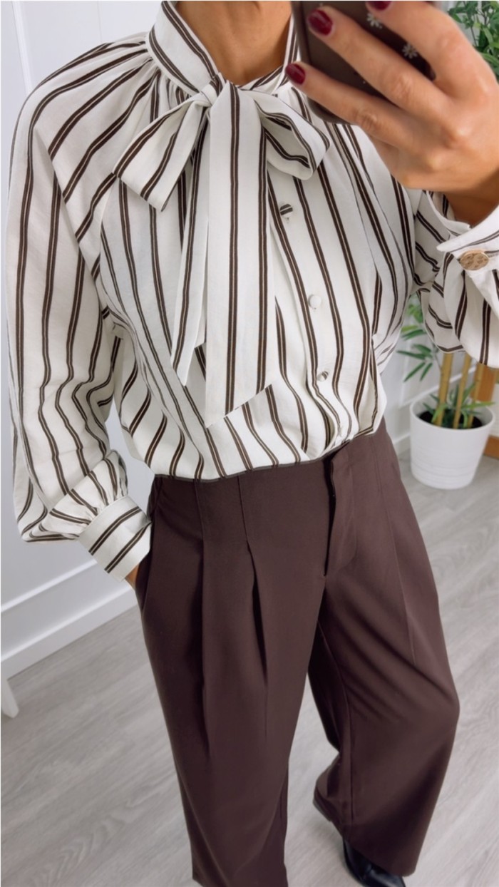blusa lazo cuello fondo blanco y dobre raya en marrón chocolate