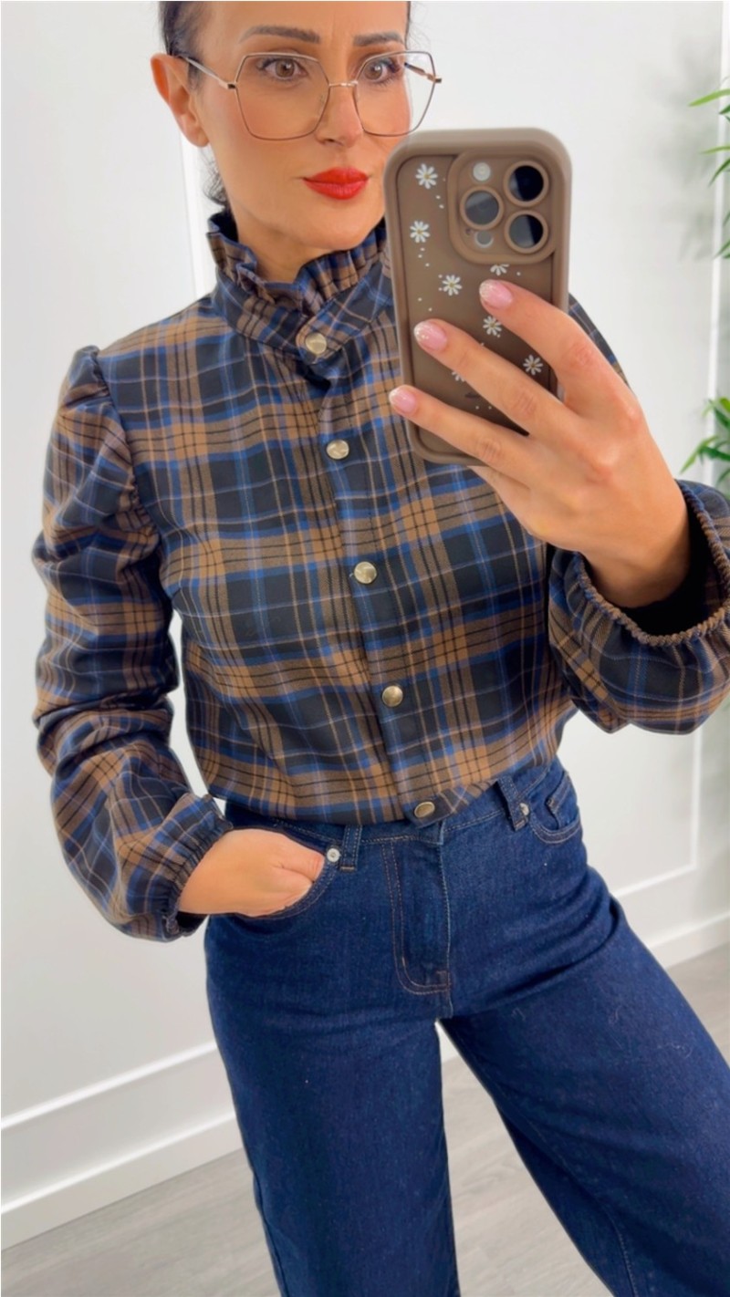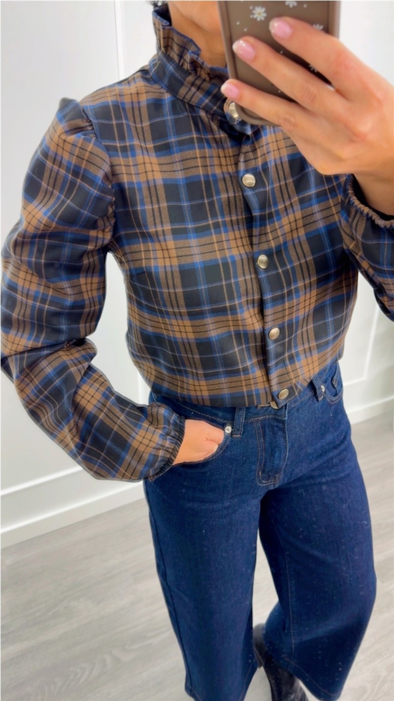 blusa cuello mao cuadros azul, negro y marrón botones click