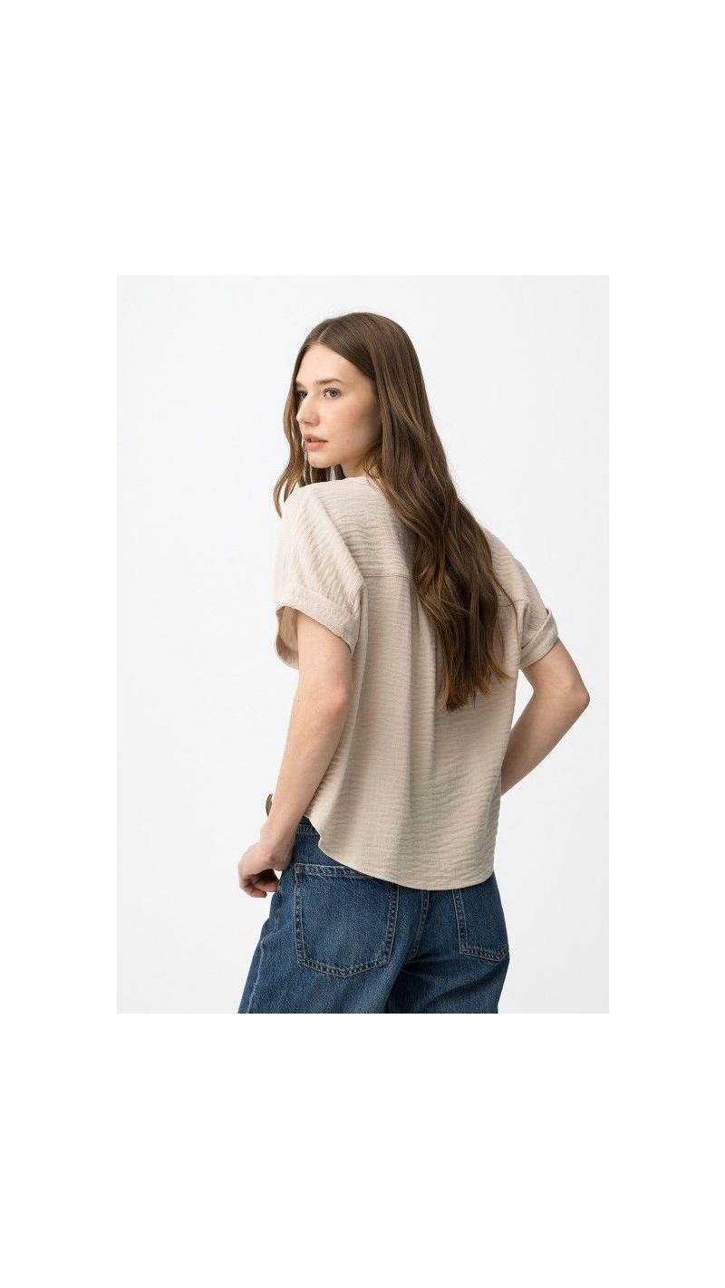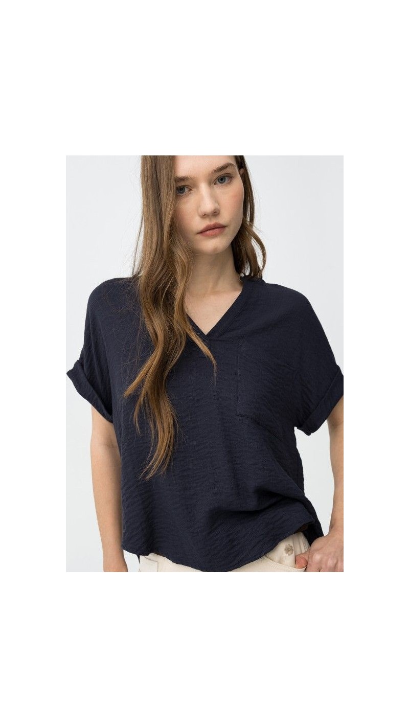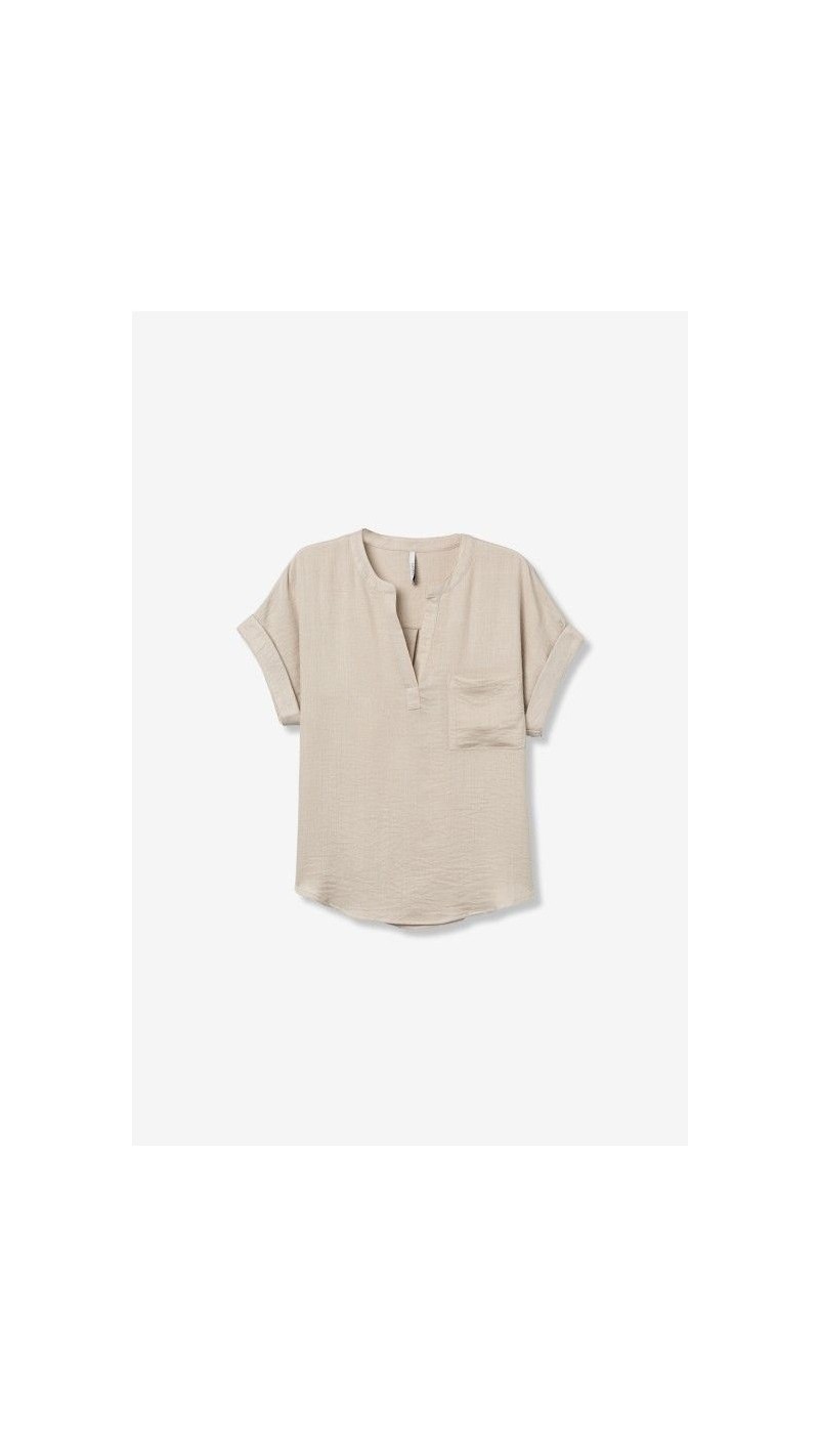 blusa satén bolsillo cuadrado delantero, beige y azul marino