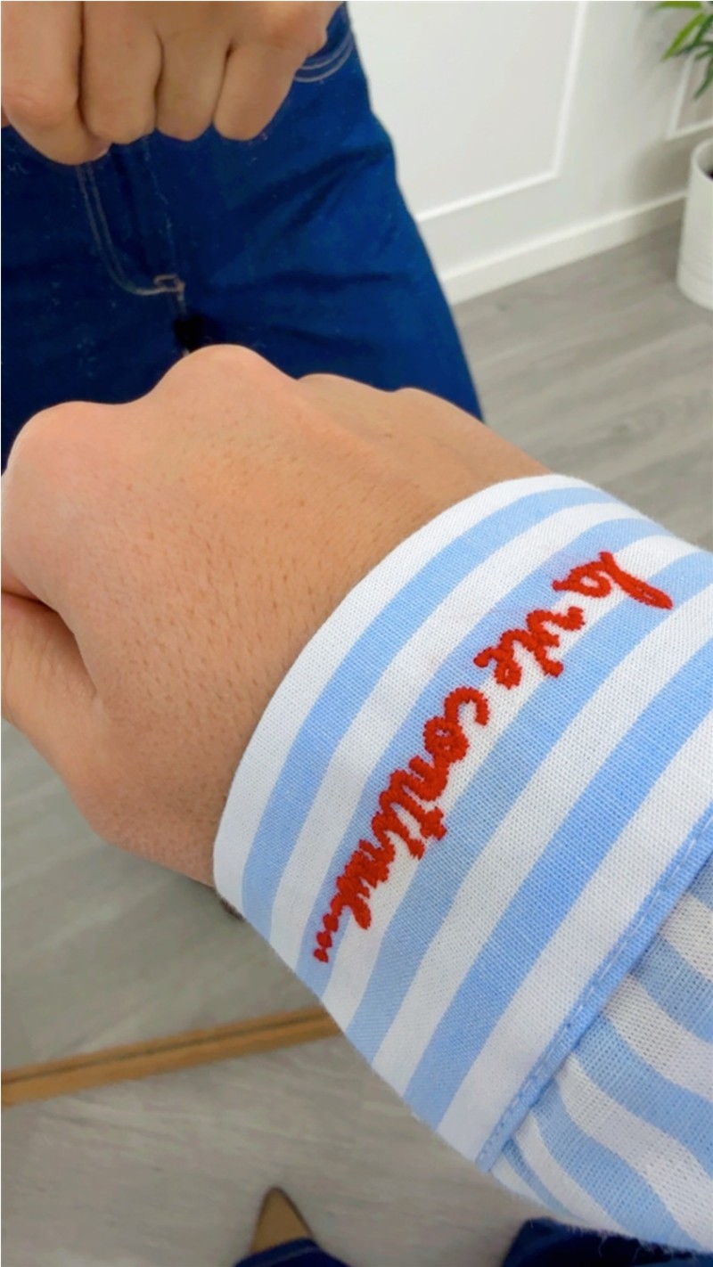 camisa de rayas en azul claro detalle botones en rojo, corazones en cuello y frase en puño