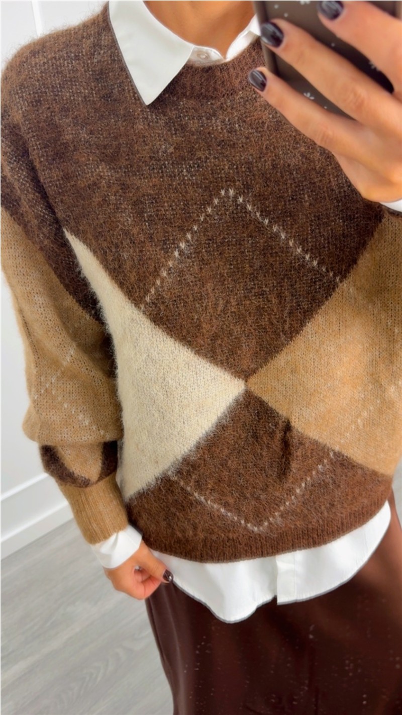 jersey rombos azul marino y marrón, cuello redondo MARRON