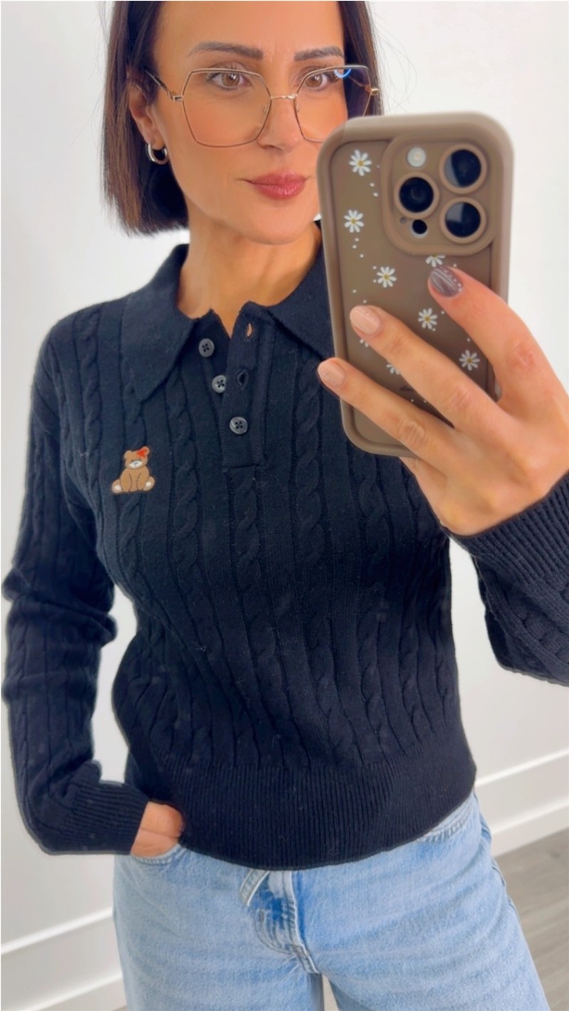 JERSEY TIPO POLO TEJIDO SUAVE DETALLE OSO, NEGRO Y BEIGE NEGRO