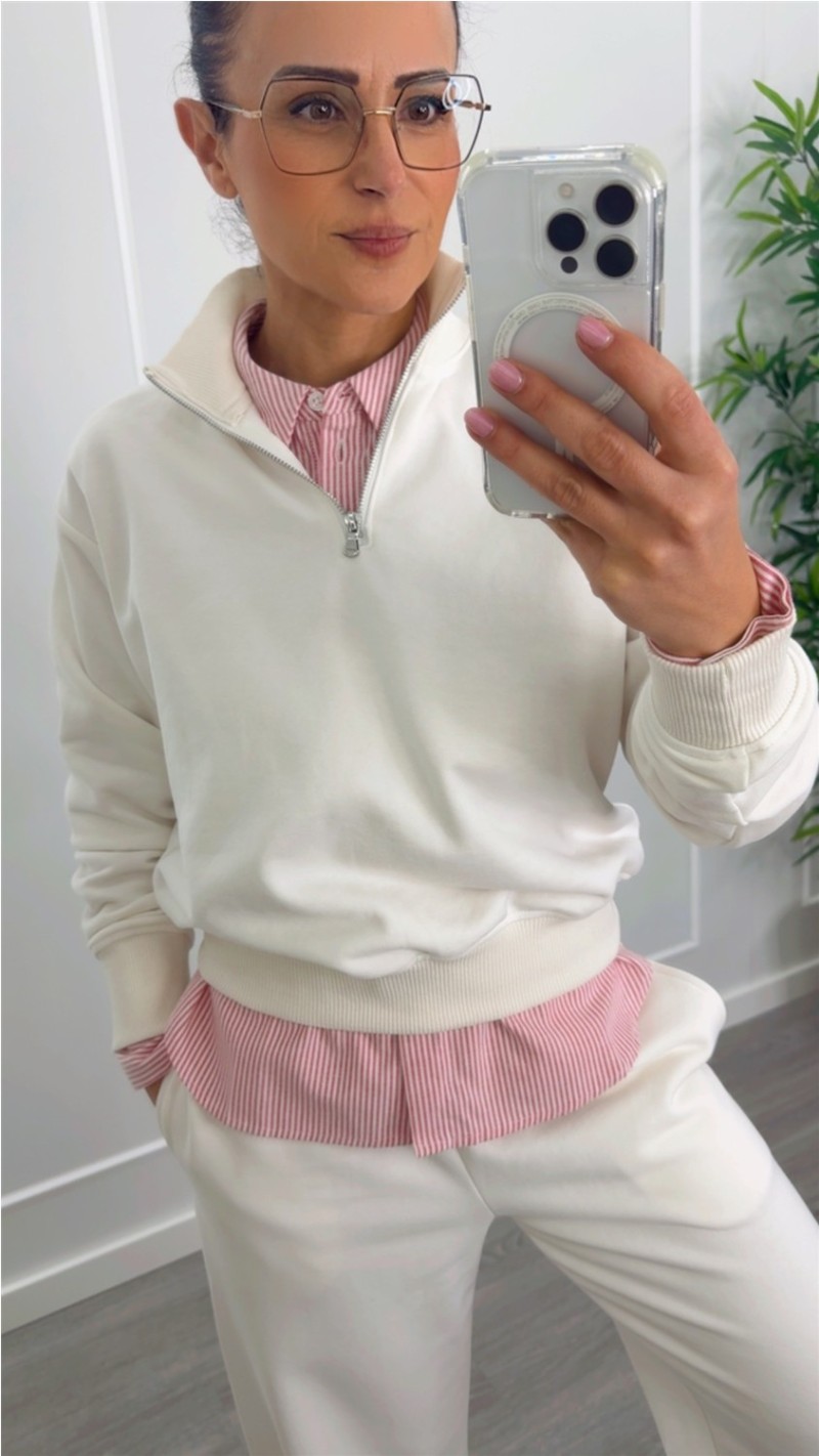 CHANDAL SUDADERA MÁS PANTALON GRIS Y BLANCO CON PANTALÓN FLUÍDO Y DETALLE CREMALLERA BLANCO