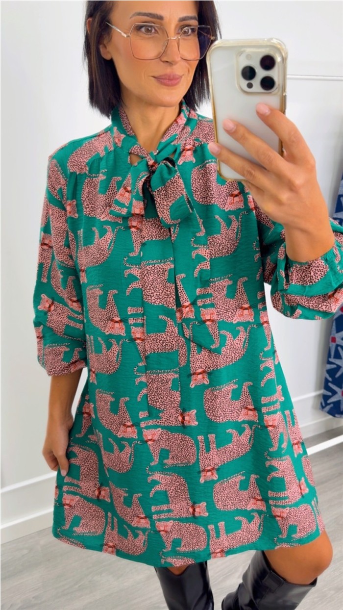 Vestido estampado leopardo cuello lazo